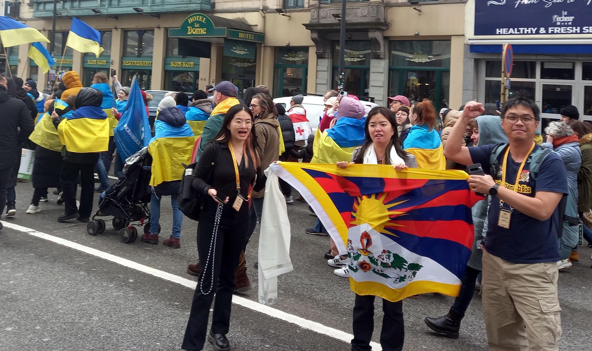 Una mujer de la marcha ucraniana se acercó y entregó una bandera de Ucrania a una participante de la conferencia del Tíbet, y esta última le dio una típica bufanda blanca tibetana. Fue un momento mágico de solidaridad democrática internacional, donde confluyeron en la capital de la Unión Europea quienes reclaman por la libertad y soberanía de dos territorios invadidos por autocracias: Rusia en Ucrania y China en el Tíbet.