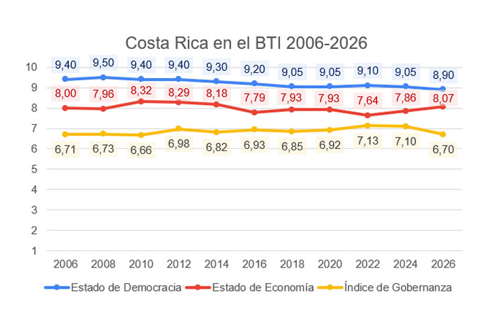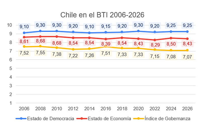 Desde 2006, el Bertelsmann Transformation Index de la fundación Bertelsmann Stiftung en Alemania analiza y evalúa cada dos años la calidad de la democracia, los resultados económicos y la gobernanza en todo el mundo. La muestra actual incluye 137 países. Veintitrés países de la OCDE, entre ellos Alemania, Estados Unidos o España, no forman parte actualmente de la evaluación. La evaluación se basa en más de 5.000 páginas de informes detallados por países elaborados en colaboración con cerca de 300 expertos de las principales universidades y centros de estudios de más de 120 países. El periodo de revisión actual para esta edición abarca del 1 de febrero de 2023 al 31 de enero de 2025. El BTI es el único índice comparativo internacional que mide el desempeño de la gobernanza utilizando sus propios datos primarios y ofrece un análisis exhaustivo de la capacidad de dirección política en los procesos de transformación.